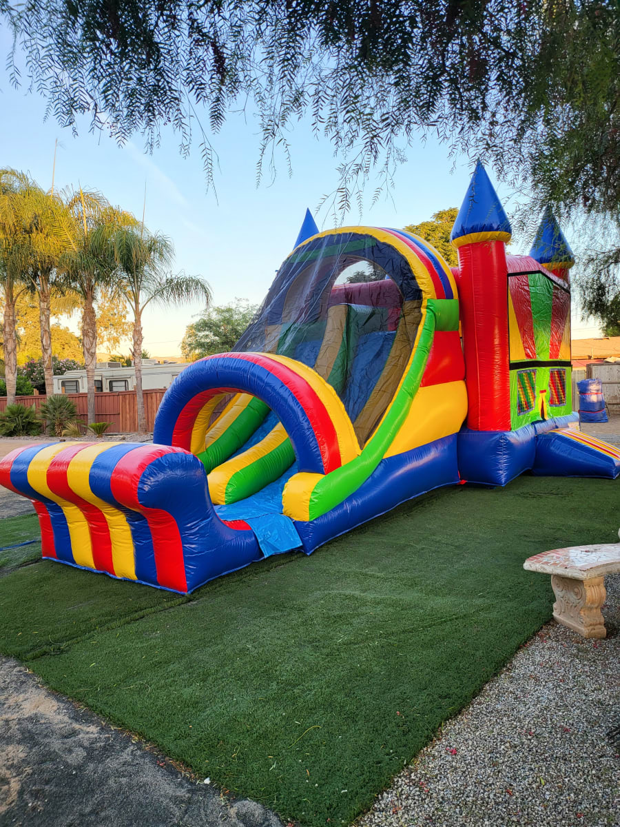 This bounce house combo is available with a dry slide as pictured, and you can also add a splash pool during the summer months to make it a Water slide party for an additional $50. Make sure to select this option at checkout!
