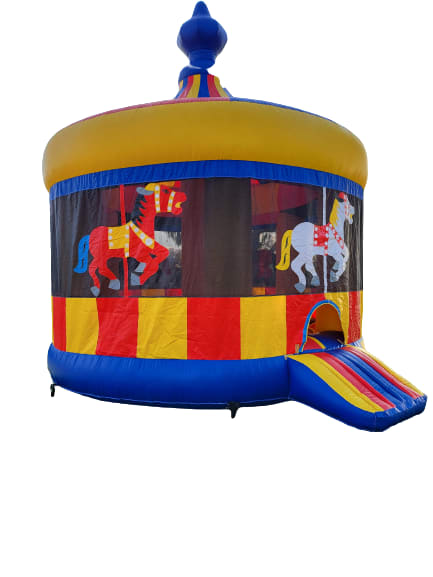 A majestic carousel-themed jumper is here - beautiful carnival style entertainment for children! This 16ft Carousel bounce house is a round inflatable featuring colorful horses surrounding the outside of the mesh safety netting. Children of all ages will enjoy hours of fun leaping across the bounce platform and shooting hoops into the inflatable basketball hoop, with enough space to accommodate 8-12 kids at once, this whimsical inflatable is a safe and exciting way to spice up your next event!