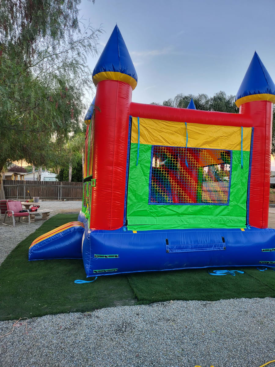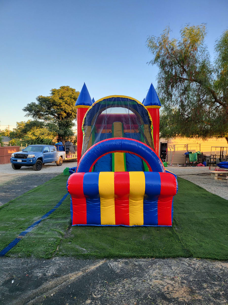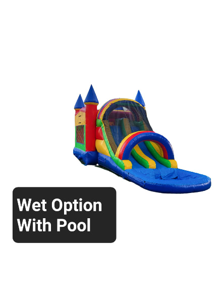 This bounce house combo is available with a dry slide as pictured, and you can also add a splash pool during the summer months to make it a Water slide party for an additional $50. Make sure to select this option at checkout!